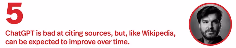 “Unlike humans, large language models can ‘read’ fast enough to keep up with the onslaught of new papers in the life sciences. However, current versions are still insufficient for academic use. Principally, this is because the kind of model used by ChatGPT cannot cite its sources. Although a master at ‘summarizing’ complex bodies of literature, ChatGPT can’t tell you where it got a specific idea from, nor where you can look for more information. Not only does its inability to cite sources raise ethical considerations, it is the major barrier to more widespread adoption in the sciences. But, this will change. I predict that within the next two years, there will be large language models that can summarize data with the speed of ChatGPT and the accountability of Wikipedia. A ChatGPT that can cite its sources will change the face of research in the life sciences.”